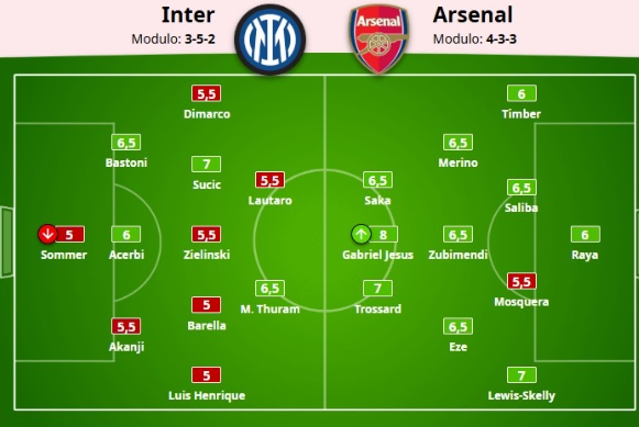 1月22日讯 本轮欧冠焦点战中,国际米兰主场1-3不敌阿森纳,无缘胜利。赛后,意大利权威媒体《米兰体育报》为两队出场球员及主帅进行了评分,评分精准反映了场上表现,阿森纳前锋热苏斯以8分高分成为全场最佳,而国米多名主力仅获5分左右的低分,整体表现不及预期。